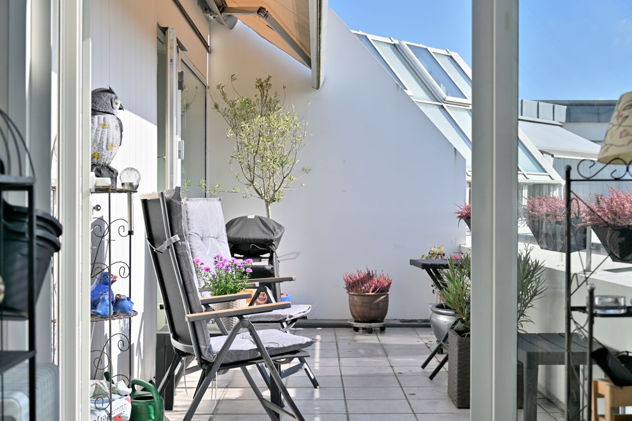 Penthouselejlighed med prima beliggenhed på vestsiden af bebyggelsen og med glasatrium - altan - elevator m.v.