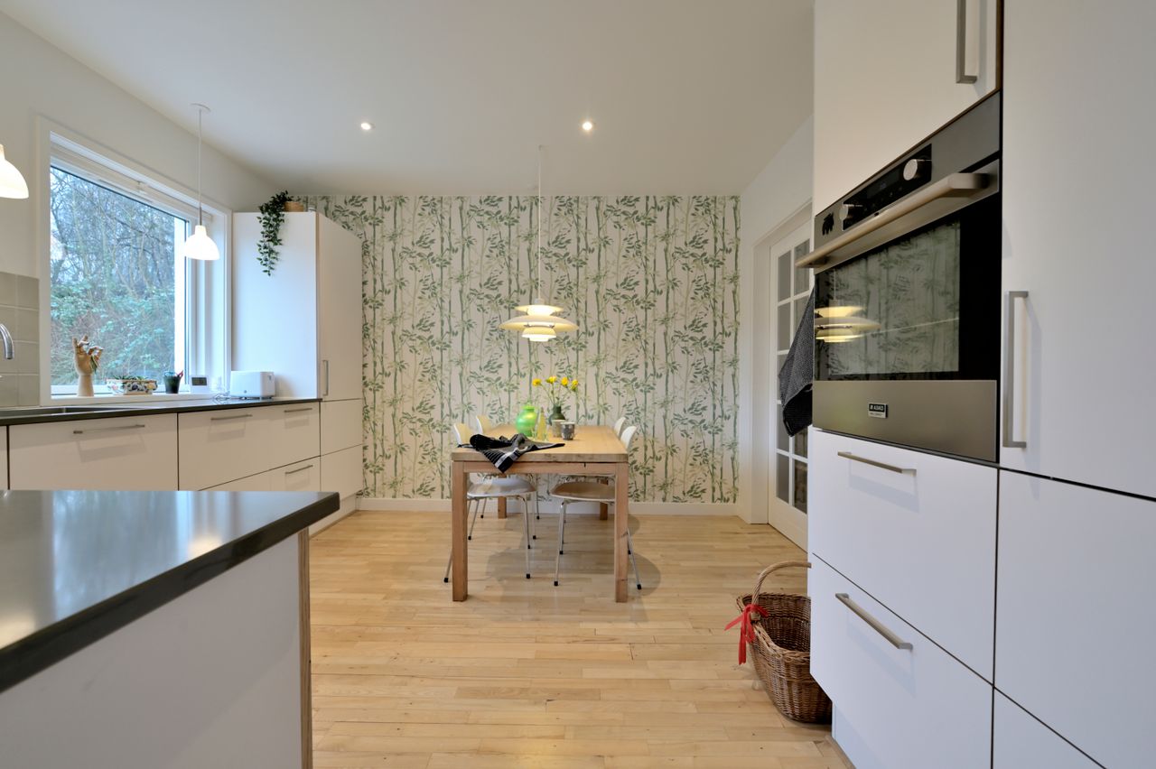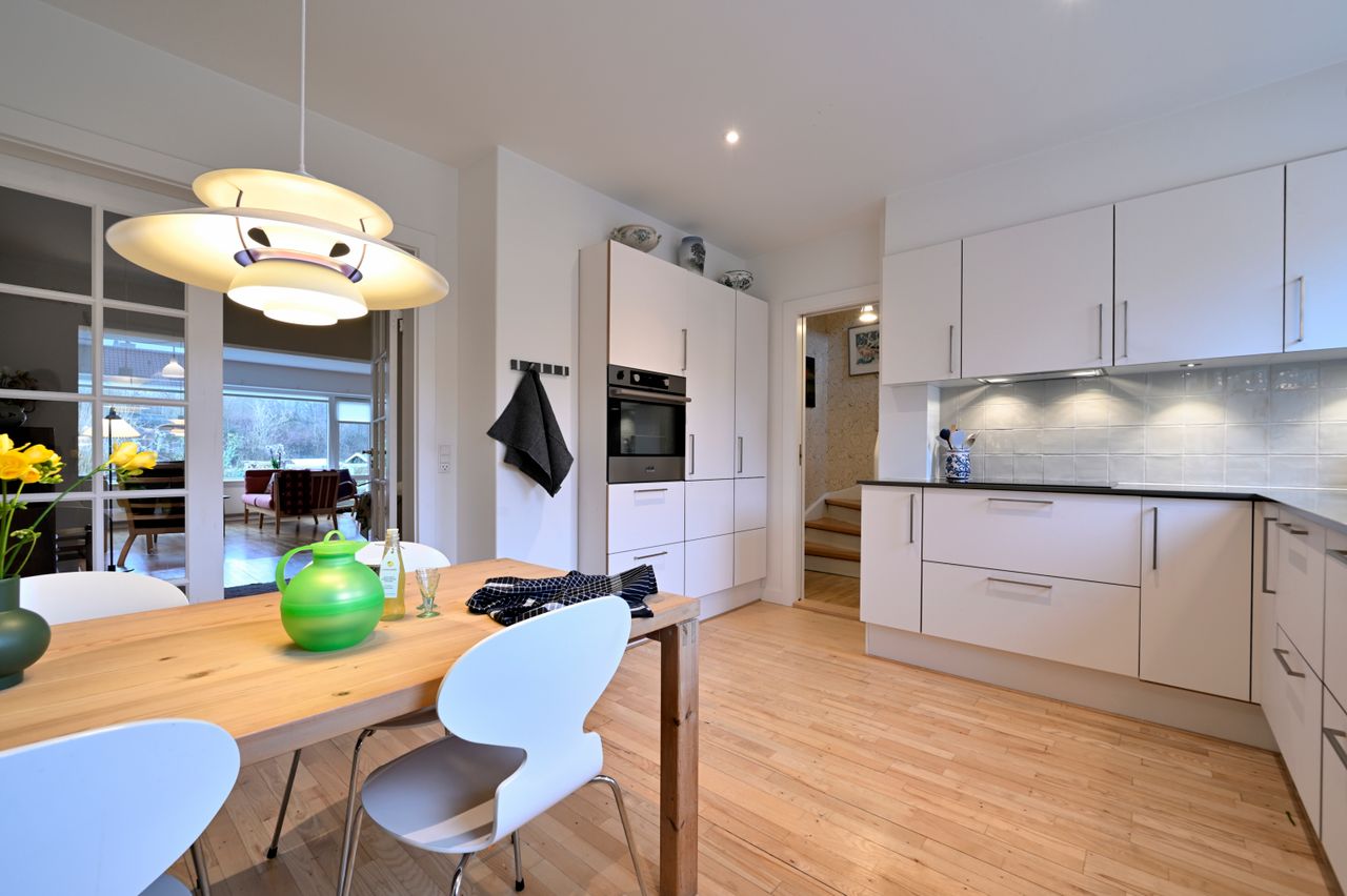 Indeholder: Forstue med trappe til 1. sal og kælder, stort nyere hvidt JKE-spisekøkken med alt i hårde hvidevarer, rummelig spisestue i åben forbindelse til skøn opholdsstue, hvorfra der er direkte udgang til solterrasse og have. Haven ligger ud til større grønt fællesareal. På 1. sal er der 3 gode lyse værelser, de 2 med udsigt til havesiden, et klassisk badeværelse med hvide 15x15 fliser og terrazzogulv. I kælderen er der to store værelseslignende rum med flot dagslysindfald, et ekstra brusebadeværelse, fyrrum, vaske-tørrerum/bryggers og viktualierum - og så er der masser af skabsplads i hele huset.